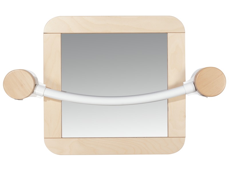 Choice of colours WHITE - BLUE - Mirror: side: 48.2 cm. Bar: L: 72 cm - Ø 3 cm. - Made from Varnished PLYWOOD (frame), PLEXIGLAS (mirror) and EPOXY finish METAL (bar). - Consists of 1 small mirror, 1 small curved bar with connectors. - Choice of bar colours.