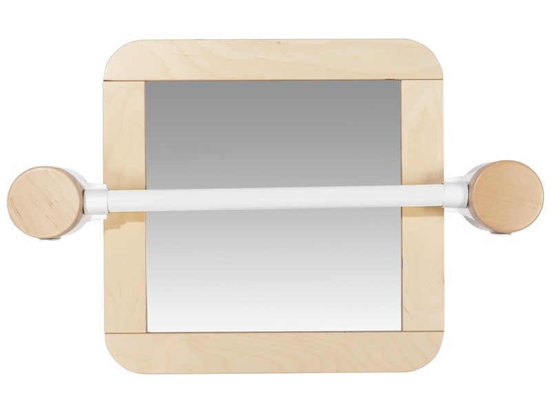 Choice of colours WHITE - BLUE - Mirror: side: 48.2 cm. Bar: L: 72 cm - Ø 3 cm. - Made from Varnished PLYWOOD (frame), PLEXIGLAS (mirror) and EPOXY finish METAL (bar). - Consists of 1 small mirror, 1 small bar with connectors. - Choice of bar colours.