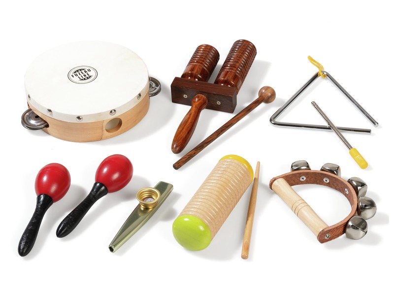 Colour various - Tambourine: Ø 15 cm. - Made from PLASTIC. - Consists of 1 natural skin tambourine, 1 pair of sound egg maracas, 1 triangle, 1 five-bell grip, 1 brass kazoo, 1 two-tone resonance tube, 1 guiro shaker.