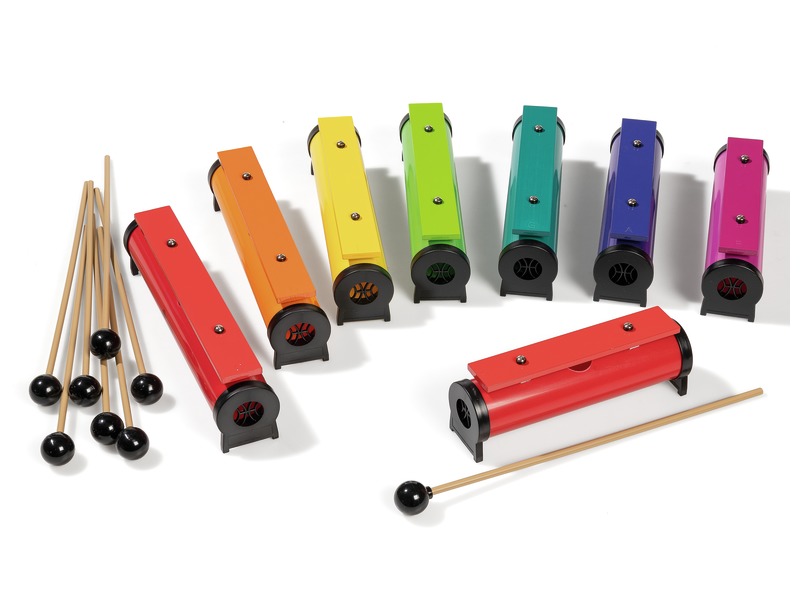Colour various - L. variable depending on the notes. W: 4.5 cm - H: 7 cm. - Made from PLASTIC. - Consists of 8 coloured keys (C2 to C3) and 8 mallets. - ASSORTMENT of 8 colours.