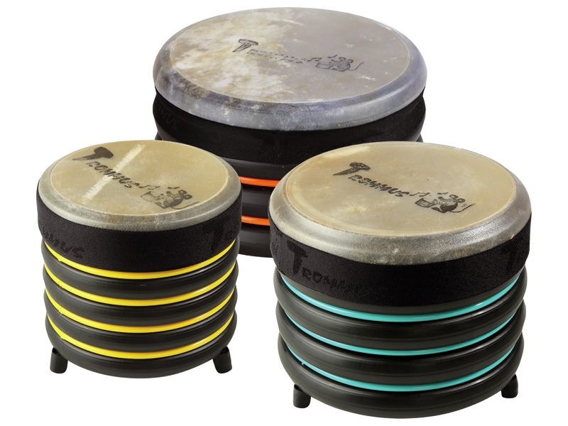 Colour various - Made from PLASTIC and NATURAL HIDE. - Consists of  1 drum diameter 16.5 cm, 1 drum diameter 22 cm and 1 drum diameter 19.5 cm.