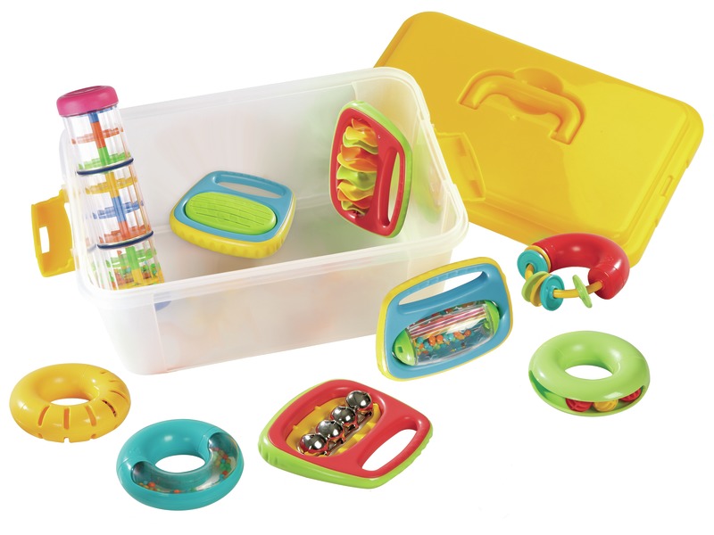 Colour various - Rattle: L: 12 cm - W: 11 cm. - Made from PLASTIC. - Consists of 4 rings, 4 rattles (mini cymbals, castanets, maracas, bells) and 1 mini rain stick.
