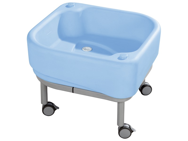 Choice of colours LIGHT BLUE - LICHEN - LIGHT GREY - Table: L: 70 cm - W: 70 cm - Min. D: 20 cm - Max. D.: 23 cm. - Made from PLASTIC (container) and STEEL (frame). - Consists of 1 small activity table and 1 wheeled frame. - 75 L.