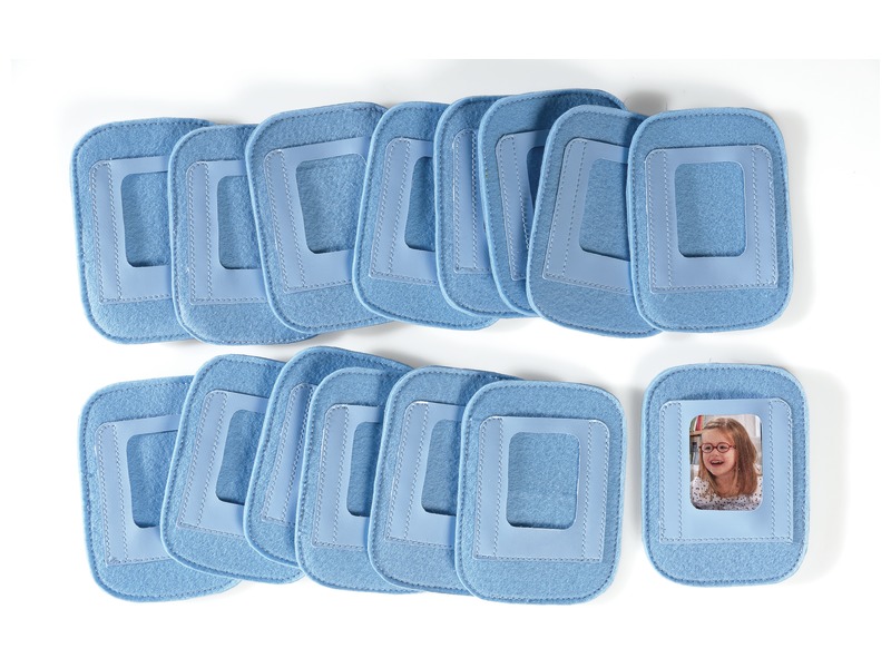 Choice of colours: LIGHT BLUE, LIGHT GREEN - L: 9.5 cm - W: 7 cm. - Made from FELT and SYNTHETIC FABRIC. - Equipped with self-adhering bands.