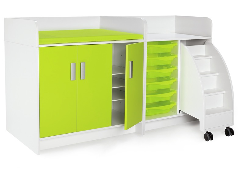 Choice of colours: WHITE, BLUE, LIGHT GREEN - H: 110 cm - D: 77.5 cm. H of changing area: 90 cm. - Consists of: 9 shelves, 3 doors, 1 set of mobile steps, 1 bin, 1 changing mat (100 x 70 cm) and 1 nappy storage unit. - Washable with a sponge. - Made from MELAMINE CHIPBOARD (cabinet and changing table).