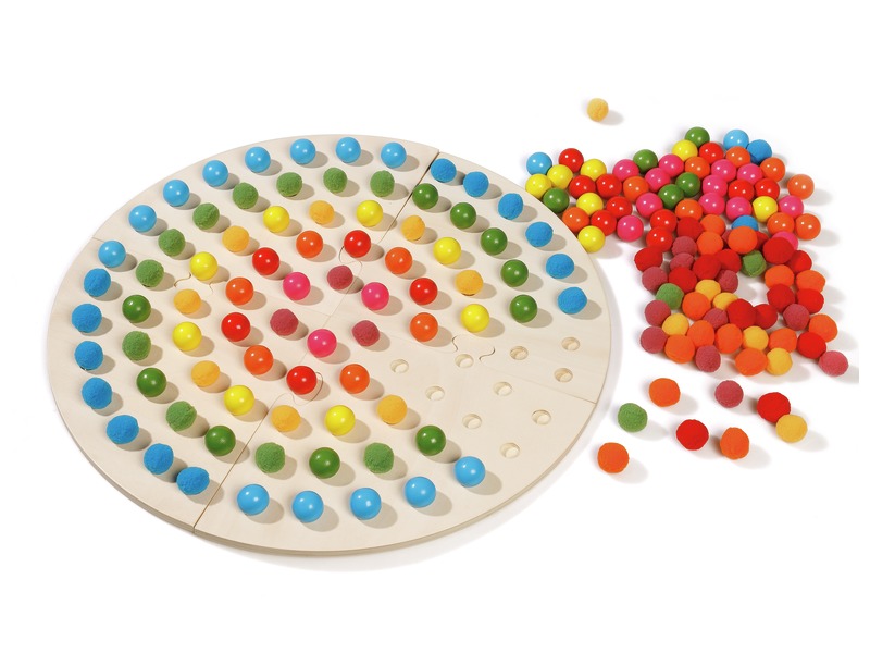Colour: various - Complete board: Ø 58 cm. Marbles: Ø 3 cm. - Consists of: One four-piece wooden puzzle board and 180 marbles. - Made from WOOD (board and marbles) and FELT (marbles).